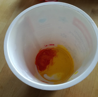 Man gibt zwei bis drei eher hellere Fingerfarben in einen großen leeren Joghurtbecher.