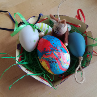 Für dieses Spiel benötigt man einen Farbwürfel, zwei (leere) Osternester oder Pappteller, etwas Ostergras und bunte Gegenstände (bei zwei Spieler/Innen jeweils in doppelter Ausführung) wie z.B. Ostereier, Blumen, Naschereien, Osterfiguren, etc.